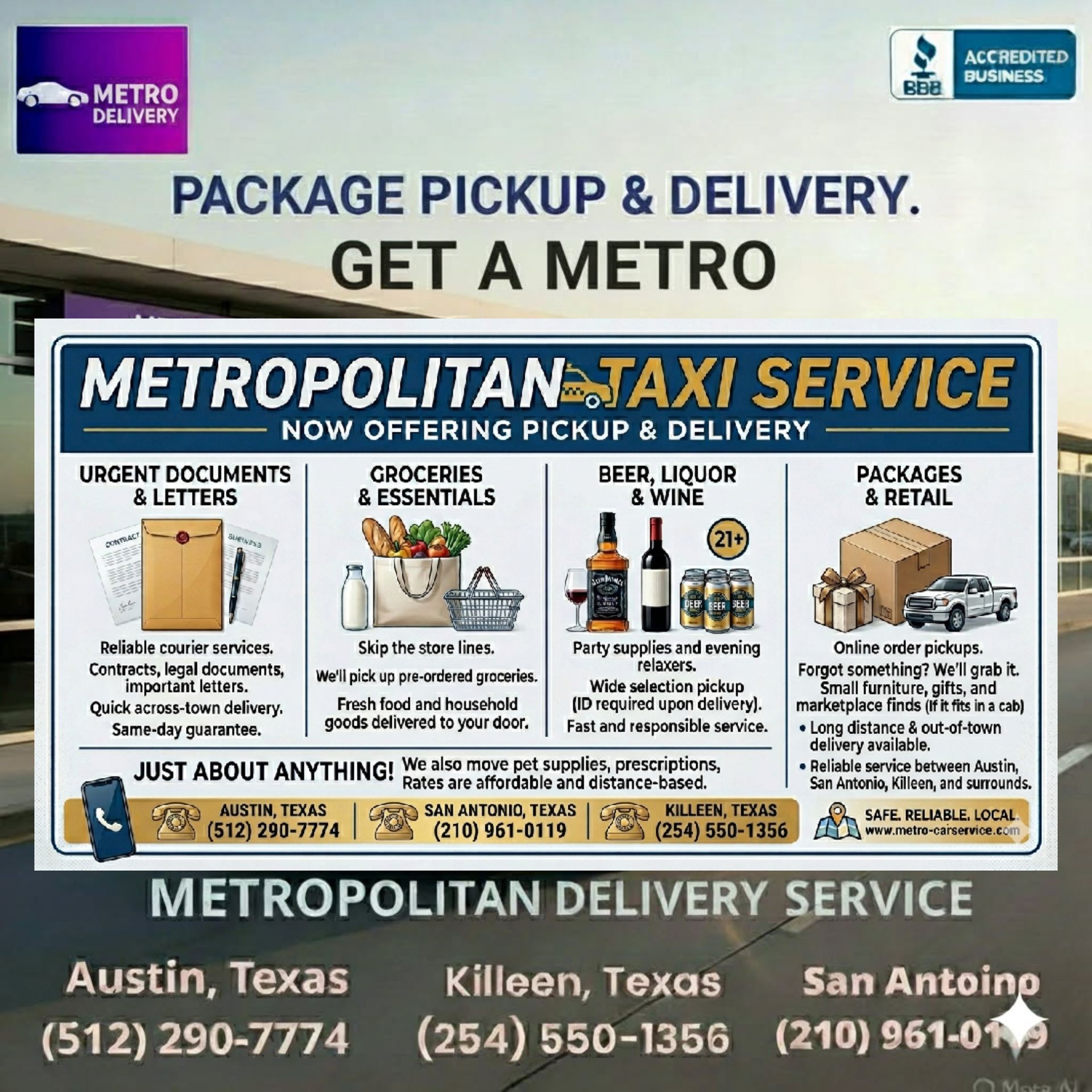 At Metropolitan Taxi Service, we’ve spent years getting you where you need to go safely and on time. Now, we’re bringing that same reliability to your doorstep. Introducing our all-new Metropolitan Pickup & Delivery Service—the fastest way to get anything across town without leaving your seat.